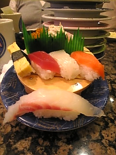 陽が落ちるのが早くなり、7時を過ぎると暗さが増してくるようになりました。 会社を出たところで、友人からのメールを開き、 にやつきながら歩いていると...。 うぎゃぁぁぁ。←あたしの声。 電灯が微妙に届かない家の前に黒い影がぁ。 立派な服装をした紳士(と言っておきましょう)が、 訝しげに私を見ています。 そうだよなぁ、当たり前だよなぁ。 自分の顔を見て、うぎゃぁぁぁ、と言われたら(笑)。 思わず、すみませんすみません、ごめんなさいと逃げ去った私。 でもさ...本当に、びっくりしたんだよね(笑)。 友人のメールを読む=気持ちが和んでる=暗がりに浮かぶ顔=怖い(笑)。 目がばっちりあっちゃってるだけに、 申し訳ない気持ちも100倍...。 でもさ...怖かったです(爆笑)。 お寿司の大きさにご注目。 手前が普通のお寿司のサイズ。 奥の4つの小ささが解るでしょうか?。 回転寿司で見つけました。 ほんと一口サイズの可愛いお寿司でした。 なんか、いっちょ前だよなぁ(笑)。 一皿に6個(だったかな)乗ってました。 *母の脳梗塞事件のために、乗せられなかった写真です。 多分、これからも順次、無関係写真がアップされる事でしょう(笑)。* |