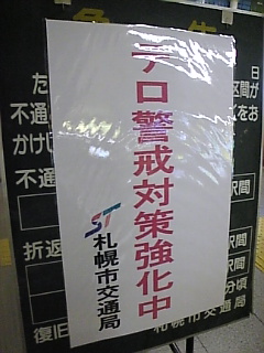 あと1ヶ月少々だなぁ...。 って事で、札幌市内もそろそろ準備に入ったようです。 まず、5月。 通勤途中で、パトカー、白バイの連隊に出会いました。 なんとなく訓練中に見えました。 だって、一台二台じゃないんだもん(笑)。 5台以上の、かたまりになって道路をゆっくり走るなんて(笑)。 これは絶対に訓練でしょう、うんうん。 そして、今日...。 地下鉄改札に、こんな立て札が立ちました。 ←なんか怖い(笑)。 慌てて撮ったので光っちゃった。 (不審人物と思われたら困るので、 なんか、あせっちゃったのだよ。) テロ警戒対策強化中って...。 地球上の小さな島国の、 これまた遠い地方にテロなんて...。 昔「田舎だからノストラダムスは来ない」って、 思い込んでいた事を思い出しました。 *普段から超激務、超危険な仕事についているVIPな方達だから、 北海道のおおらかさを満喫してもらいたいなぁ。 話し合いの後は、のんびりしてほしいです。←サミットの意味解ってないかも。 テロリストの皆さん、お願いですからあんまり来ないで欲しいです。 道庁爆破を思い出させるような、 そんな事しないでくださいね。 同じ地球の仲間じゃない、仲良くecoしよう、エコ。*
