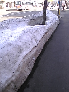 あれほど積もっていた雪も、 すっかりなくなりました。 と、言いたいところですが...。 完全にはなくなってはいません(笑)。 高く積まれた雪って、なかなか融けないもんですねぇ。 表面が固くなってしまった雪は、 10度前後の陽射しでは、ちょっと無理っぽい。 今日の札幌は雲ひとつない綺麗な青空。 のんびり、ぽかぽか日曜日でした。 ←ね? ほんと、びっくりするくらいに、 綺麗な青空でした。 この時期、ほんと服装がばらばらです。 ブーツの方もいれば、 サンダルの方もいます。 ちなみにあたしは、ローファー(笑)。 かかと、は寒くて出せません(笑)。 ←札幌雪事情。 道路歩道は綺麗なんだけど、 融け残った雪がこんなに...。 スコップで壊して、ばらまけば、 あっという間に融けるんだけどね...。 綺麗だった雪も、 埃や汚れで、かなり汚い状態。 そうそう、今日、ミミズ、見ましたよ(笑)。 やっぱ春なんだぁ...(謎)。 *今はアスファルトばかりになりましたが、 幼少の頃(笑)、札幌の春は道がぐちゃぐちゃでした。 入学式やら新学期やらに、 白いタイツをはかされていたんだけど、 いつも、後ろにハネらせちゃって、 ふくらはぎの部分に泥の水玉模様を作っていました。 今では「土だけの道」って、なかなか歩けなくなりましたよね。 あの柔らかい感触が懐かしいなぁ...。*