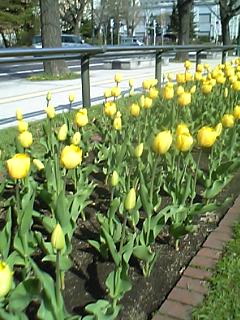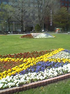 3月~4月の公園は、ちょっと汚れた雪が残り、 あまり綺麗なものではありません。 そろそろいいかな、と思い、ちょっと写真を数枚撮ってきました。 札幌市内は創成川をはさんで、西と東に分かれます。 大通公園は西1丁目から西12丁目まで、 地下鉄路線から言うと、駅ふたつ分にまたがります。 公園をはさんで一方通行の道路が走り、 市民に休息の場を提供しています。 冬は雪まつり、夏はビアガーデンと、 風物詩の中心にもなっている場所です。 ←公園の両脇(南北方向)は木々が立ち並び、 ところどころに花壇が植えられています。 丁目ごとにコンセプトがあり(多分)、 花壇のない丁目もあります。 花壇はパンジーが主になっています。 ←丁目ごとに横断する道路があり、 東西側には、チューリップが植えられていました。 この反対側(東側)は、赤いチューリップでしたが、 なぜかまだ固い蕾のままでした。 ← 南側に咲く桜。 街灯も年々おしゃれになってきました。 とても綺麗な青空でしたが、 ちょっと寒そうに見えちゃうなぁ...。 桜にもいろいろな種類があるようですが、 この桜はとても背が高く(ほんとポプラのよう)、 花びらは一重のものでした。 このあと札幌は、ライラックの季節になります。 ライラックは、それほど大きくない背丈なので、 多分、アップ写真が撮れるんじゃないか、と期待しています(笑)。
